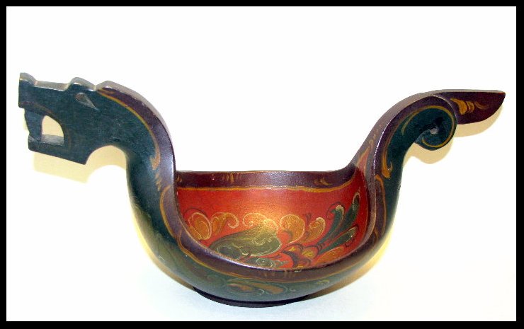 Years ago, I picked up these two late 19th-mid 20th century Norwegian dragon-style kjenge or ale bowls (ølbolle), the older pieces were usually made with horse heads, as well as similar bird form pieces called ale hens (ølhøne). This size was intended for use as drinking cups, and often floated in larger ale bowls until used by the men to dip out their beer, they were usually used for weddings and other important ceremonies or gatherings.The blue one measures approximately 9" long, with a 4" wide bowl, and the red one is 10½" long (including tongue), 3¾" wide bowl. They're often decorated with traditional Norwegian floral painting (rosemaling), but also left unpainted to show the intricate carving. These two pieces were most likely made as souvenir items and one of them still retains its old paper label.