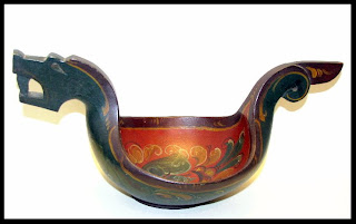 There's an absolutely gorgeous antique large ale bowl at the Erikson Gallery. There are also a number of carvers working in the traditional styles, I'm particularly drawn to the work of Howard Sherpe of Westby, WI (click on link at lower left of page to see more of his work), and of the Norsk Wood Works in Barronett, WI - and check out the family's beautiful Norwegian Fjord Horses (starting 17 pics down are details of a wonderful carved sleigh). Rosemaling is also done by many artists, Rhoda Fritsch of Aurora, IL has a great website with her work, and information on the different regional styles.