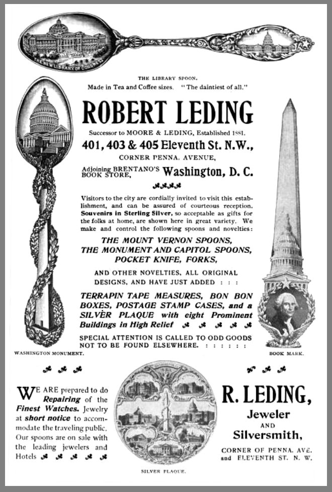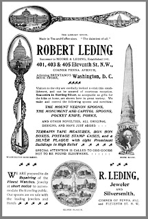 The Washington Monument, a marble obelisk towering 555' 5⅛" high and weighing 81,120 tons, was completed in 1884 after decades of planning and construction; a four-year renovation was completed in 2000. The monument, with its long reflecting pool is an awe-inspiring sight - and who can forget the scene with Forrest Gump and Jenny reuniting there? Images of the obelisk are still a popular souvenir, the 1901 advertisement below shows the spoon along with some other Washington, D.C. novelty items.