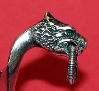 I travelled around a lot as a kid, moving to the Orlando area a month before Disney World opened in 1971, it's the closest thing to a hometown I have. When we moved here it was a small town, we could ride our horses down roads that are now busy highways, spring would bring the overwhelming scent of orange blossoms from vast acres of groves, wildlife was abundant and the pace was fairly slow and easy - very different now. The tourist industry has been big business in Florida since the late 19th century, due in large part to Henry Flagler bringing railways to the state and promoting his luxury hotels, the boom was in full bloom by the 1890s, just in time for the souvenir spoon craze. The local alligators were a popular subject, the first spoon below, with its detailed (front & back) figural handle, was made by Paye & Baker in early 1900s, the one with the alligator chomping down on the gilt orange leaf bowl was made by Alvin in the 1890s, and the perky little 'gator was made by Dominick & Haff for Jacksonville-based jeweler Greenleaf & Crosby, who held the patent rights to the design (1892 Patent D21560).