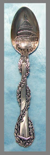This is one of my favorite spoon designs, designed by Robert Leding of Leding & Moore, Washington, D.C.; U.S. Design Patent #20,339 was issued on Nov. 18, 1890. The patent application describes it as, "...a representation of the Washington Monument, forming the main ornamentation of the spoon-handle, and surrounded by a wreath or garland entwined along the monument, and a representation of the United States Capitol building, occupying the center of the bowl.". It was a very popular souvenir, offered in tea, orange and coffee sizes, and was also available all gilt or just the bowl (a light gold-wash remains on this one).