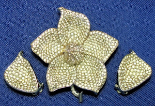 Every once in a while I run into costume jewelry so big and sparkly that I turn into that little girl happily watching Mom get dressed up to go out - like this stunning circa 1950s set of brooch and earrings by famed mid-20th century fashion designer Nettie Rosenstein (1890-1980). The large three-dimensional flower is covered in glittering pavé-set rhinestones set in silver-tone metal, the brooch is a little over 2" across, the petal shape clip earrings measure approx. 1⅛" x ¾". Typical of Rosenstein's designs, it's beautifully constructed and well-designed, with the tiny crystals still bright decades later.